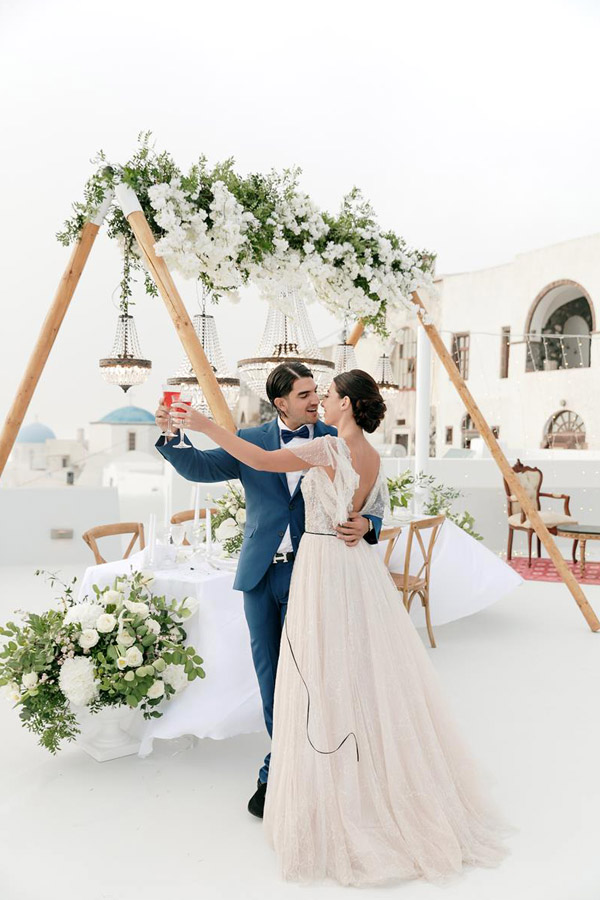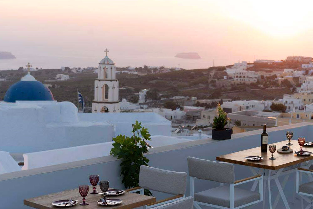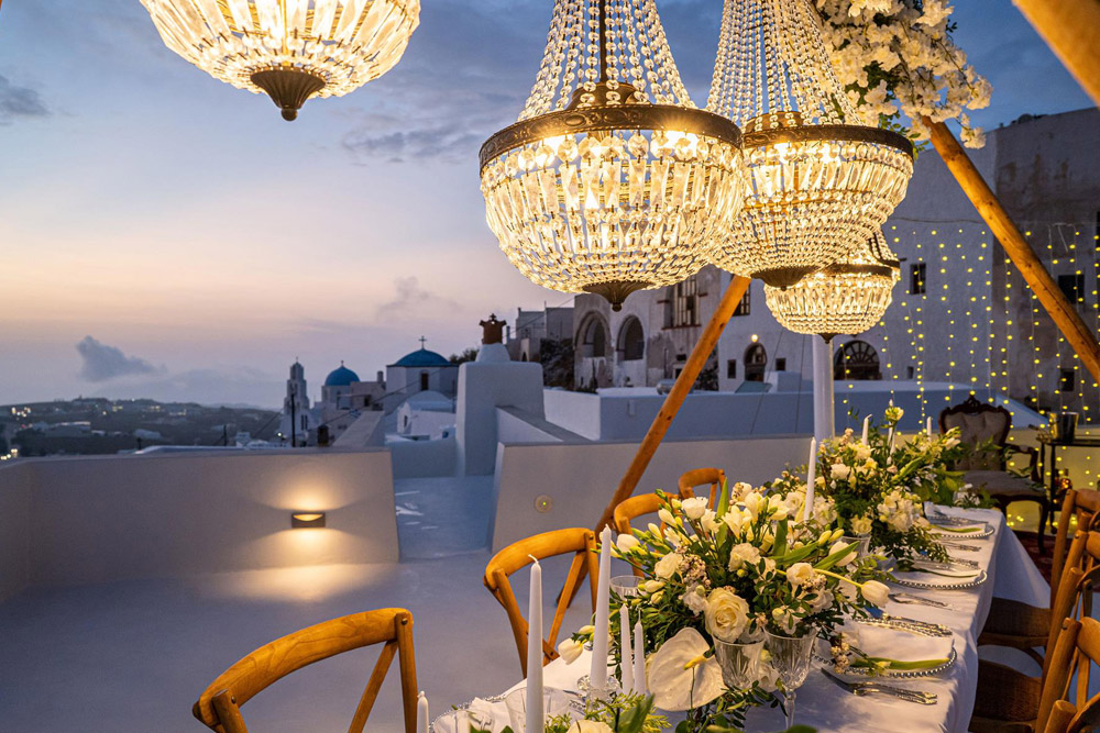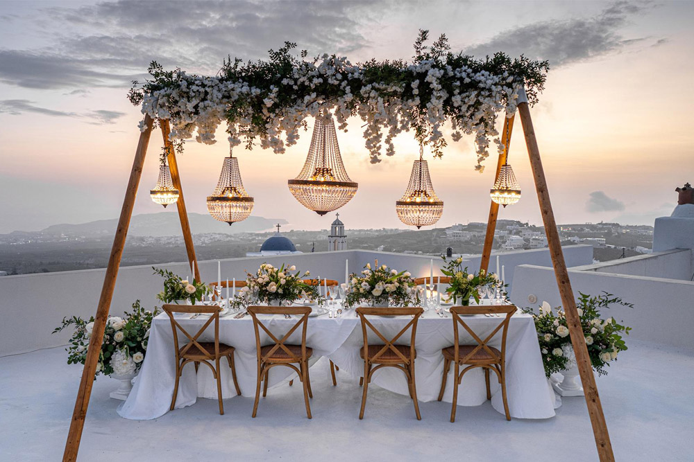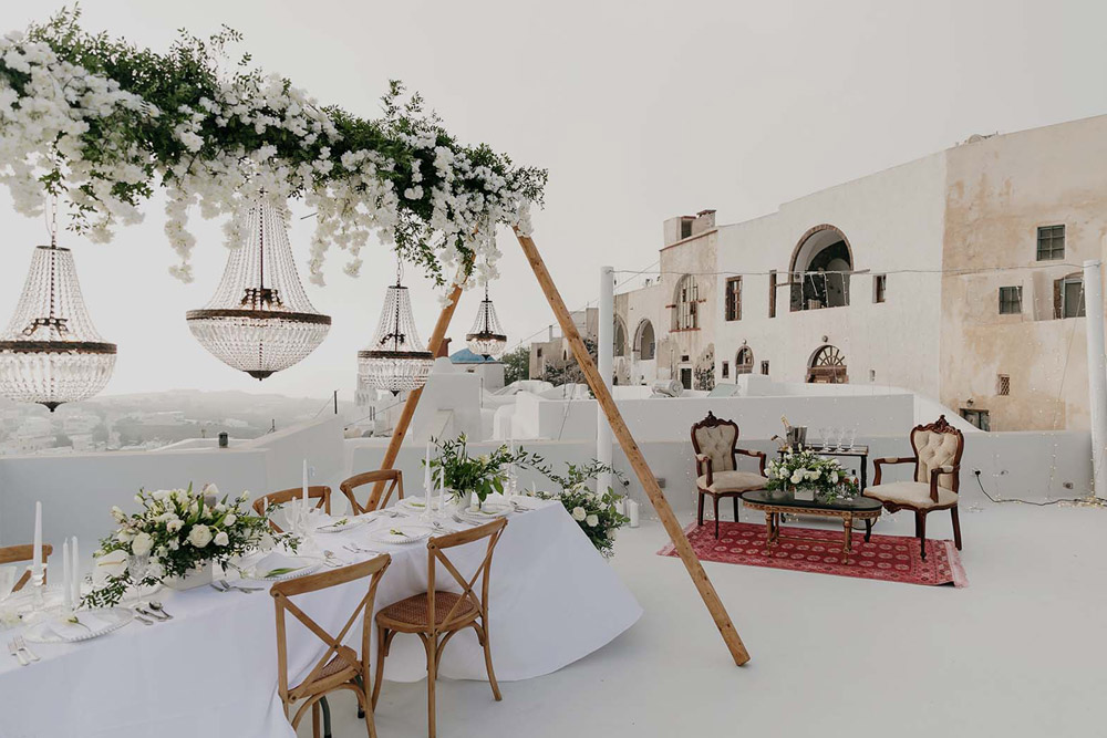 Charming and intimate, this venue is perfect for a romantic wedding. Situated high up in Pyrgos Kallistis, the upper terrace views across the hillside and as far as Akrotiri.