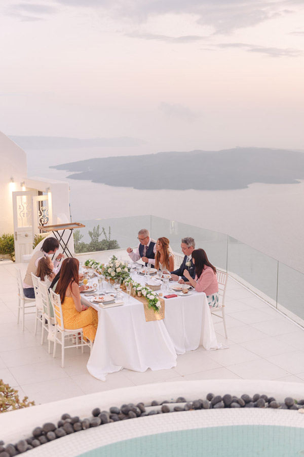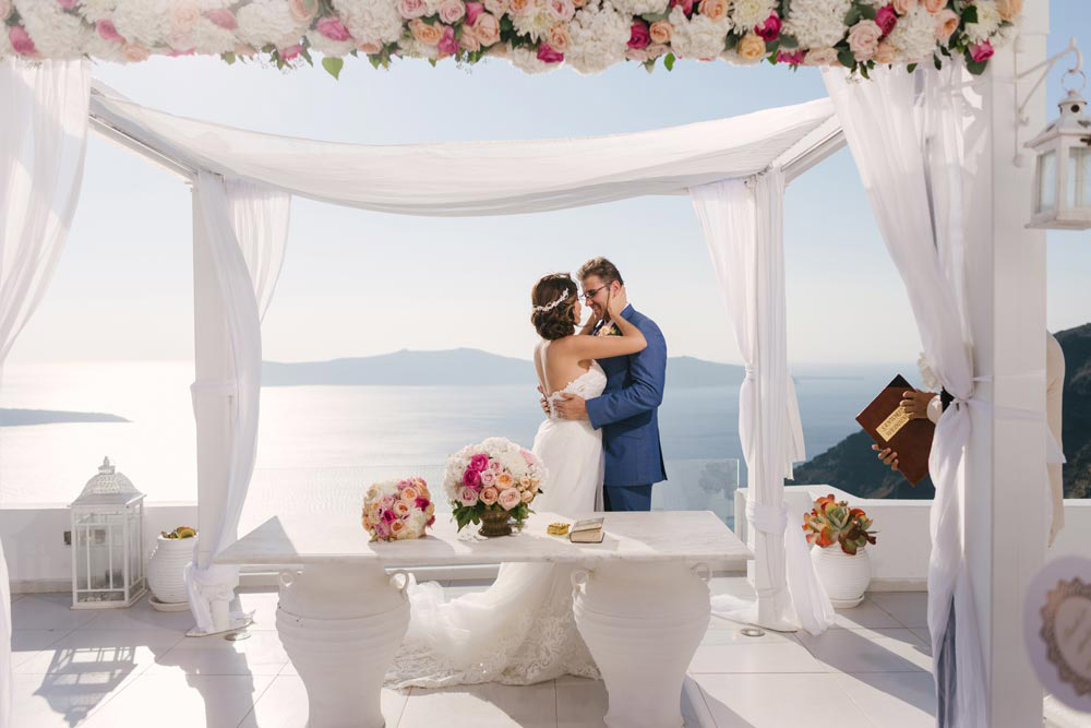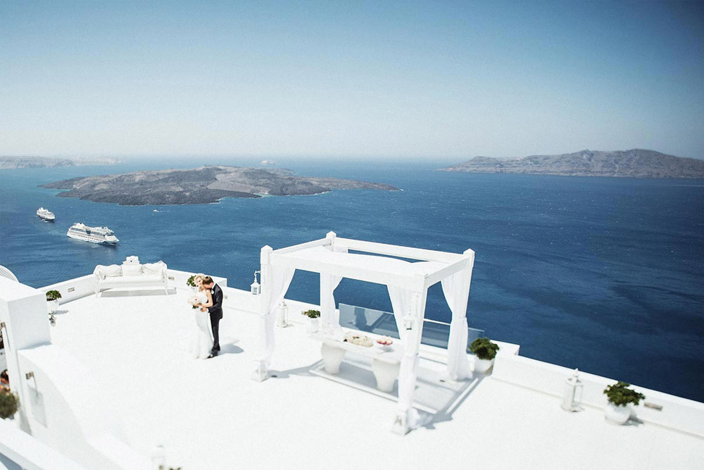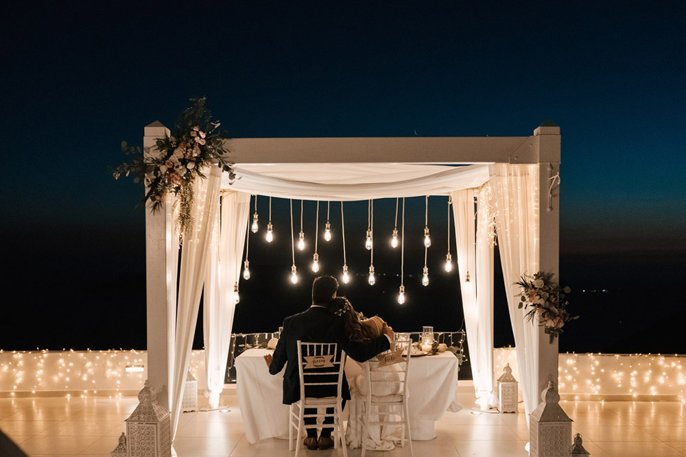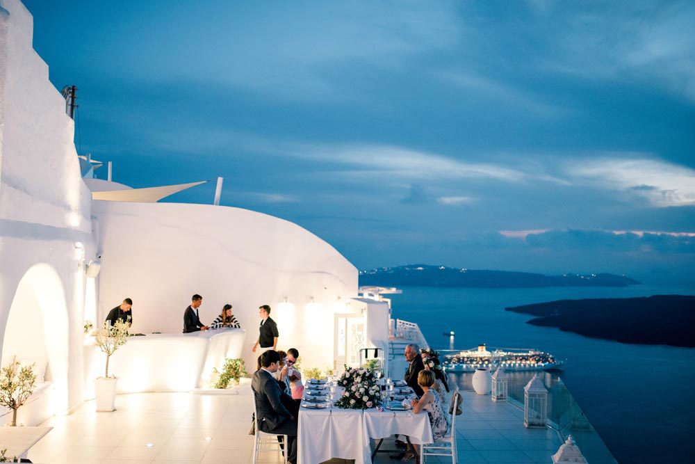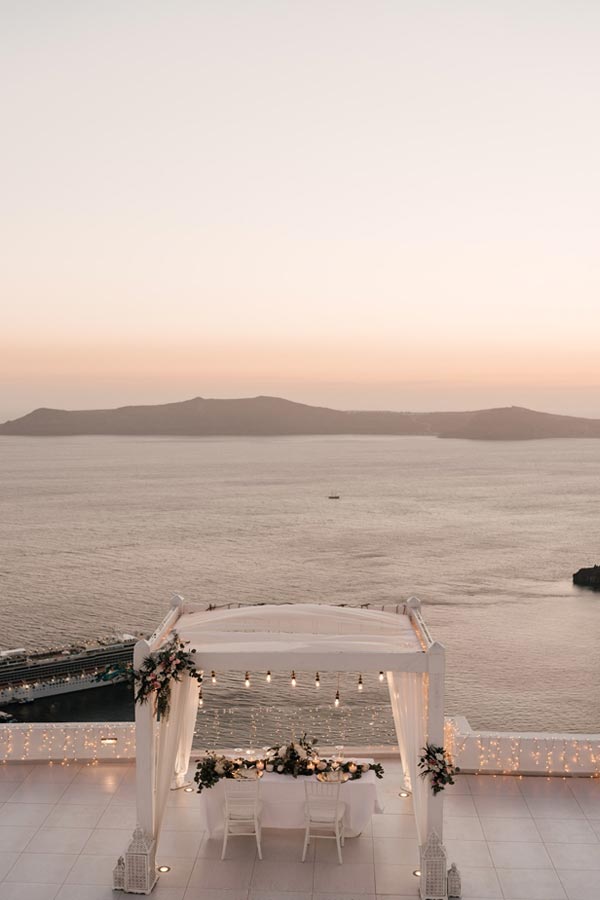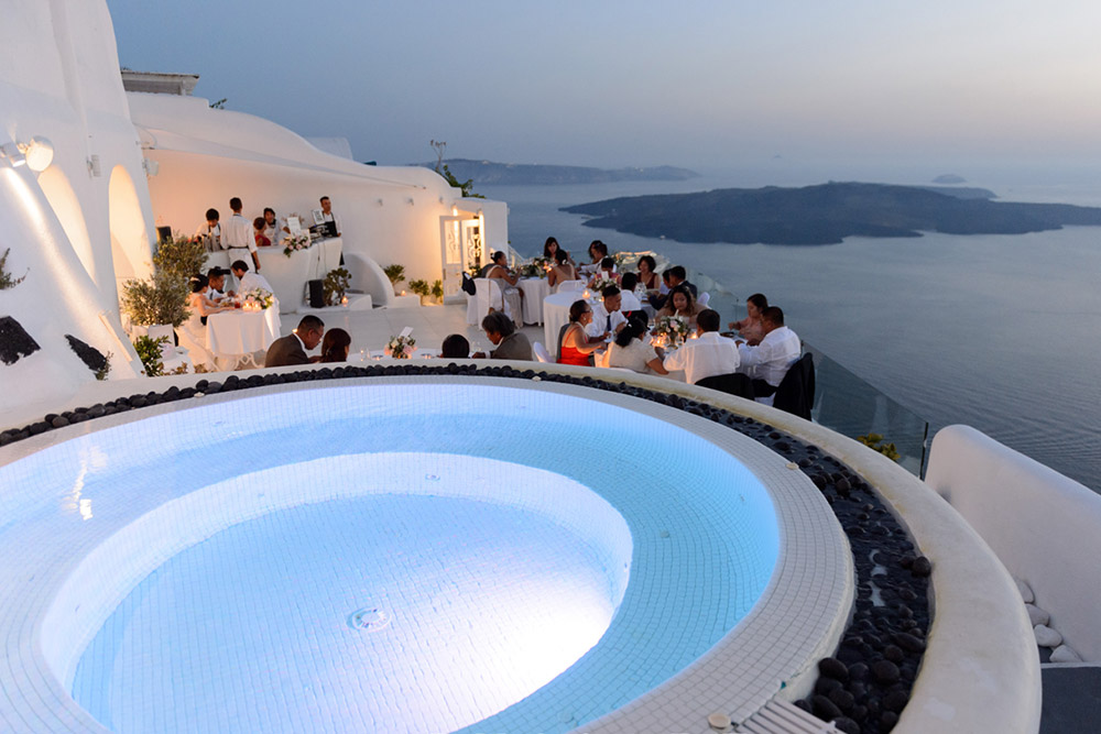 Dana Villas is volcano view in Firostefani. A traditional settlement in a quiet setting, it cascades down the Santorini caldera. There is a wonderful wedding terrace with breathtaking views of the volcano and the magnificent Santorini sunset. Whether you envision a luxurious wedding reception or a more secluded, intimate wedding day, Dana Villas will provide an unforgettable experience. The hotel can host a romantic dinner for two or a wedding reception.