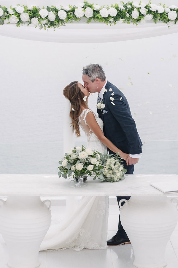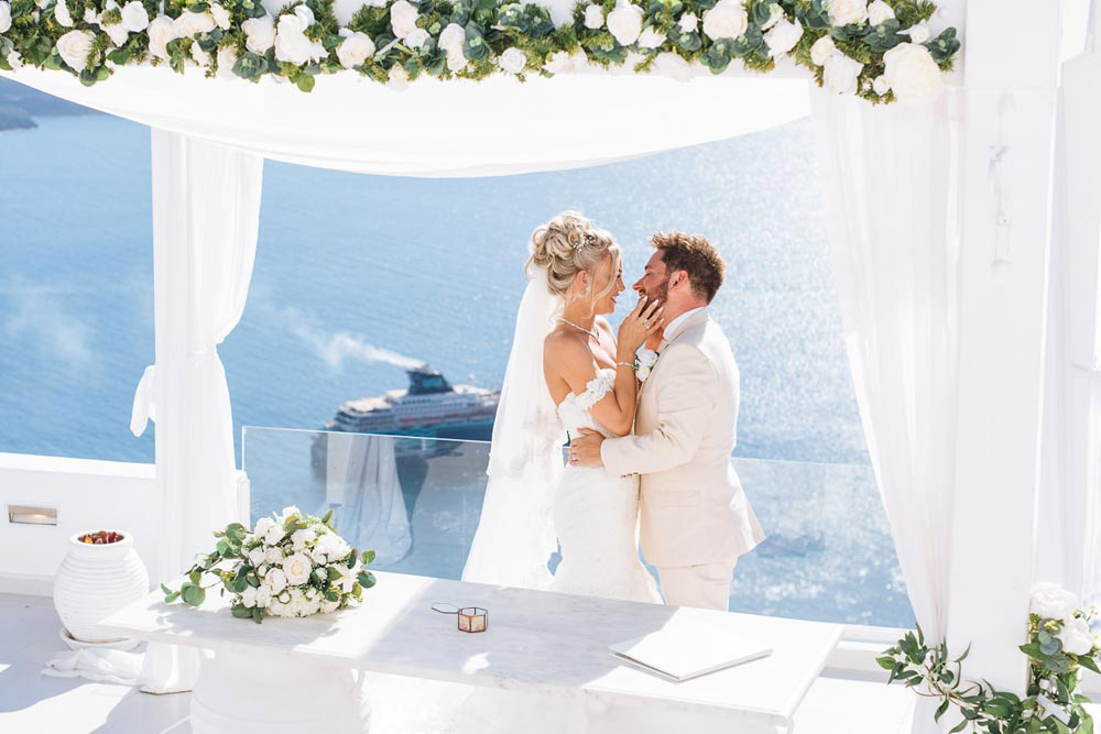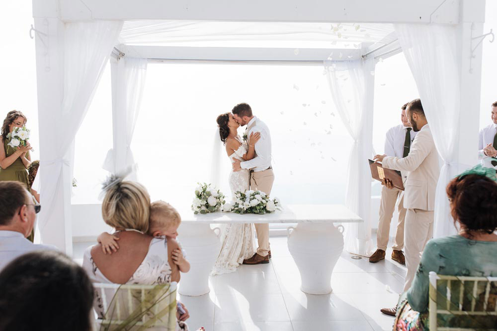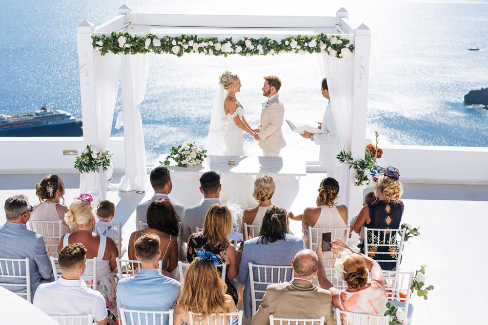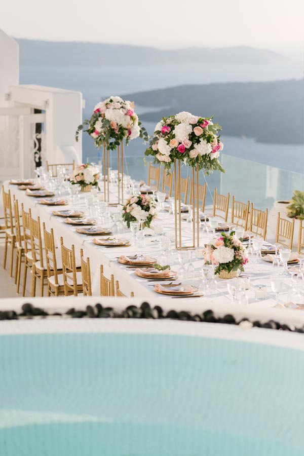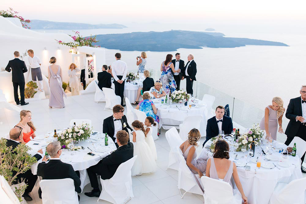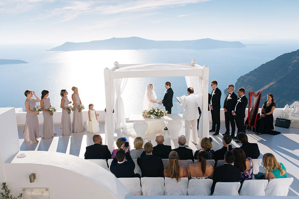 Dana Villas is volcano view in Firostefani. A traditional settlement in a quiet setting, it cascades down the Santorini caldera. There is a wonderful wedding terrace with breathtaking views of the volcano and the magnificent Santorini sunset. Whether you envision a luxurious wedding reception or a more secluded, intimate wedding day, Dana Villas will provide an unforgettable experience. The hotel can host a romantic dinner for two or a wedding reception.