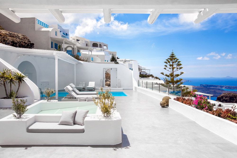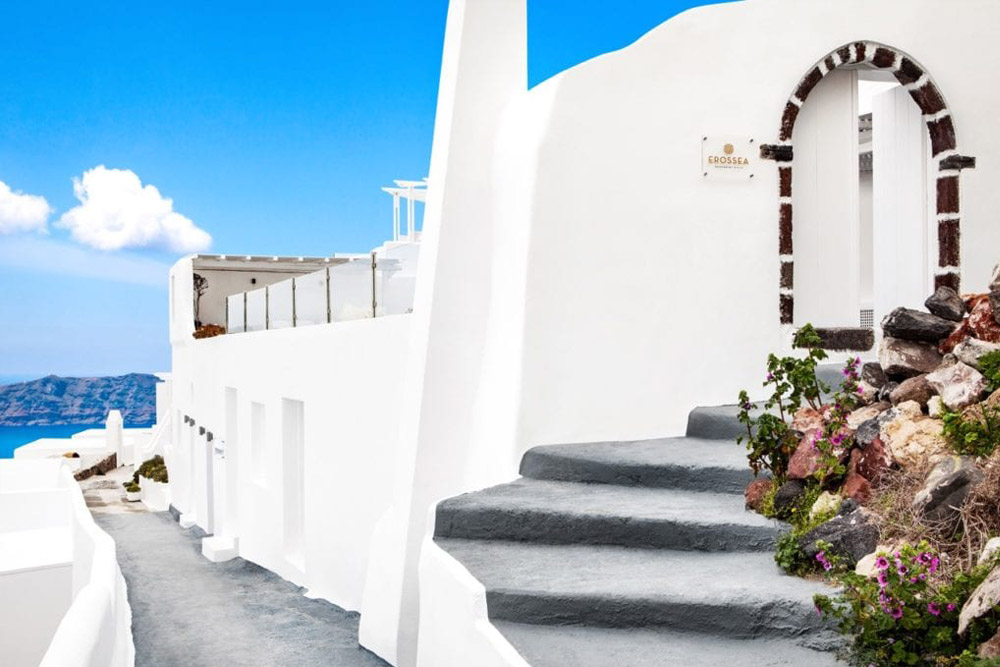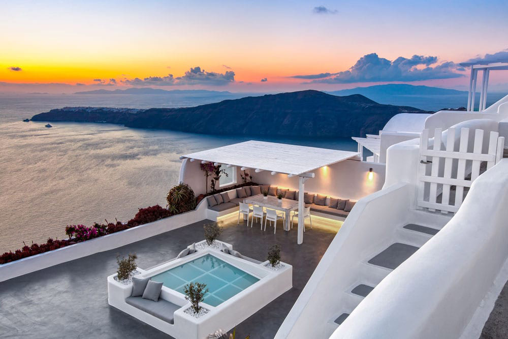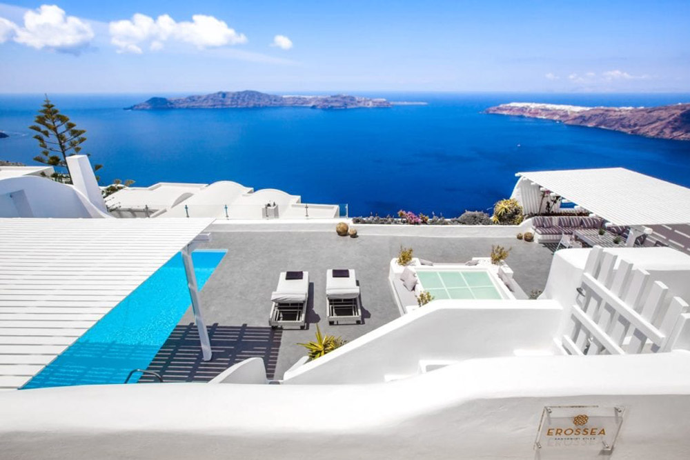 Erossea is perched at the edge of the Caldera in Imerovigli, just above Skaros Rock. It views out over the Aegean Sea towards the sunset and volcano, Oia Village and the island of Thirassia. Imerovigli is a tranquil caldera settlement known for stunning vistas and dramatic beauty.