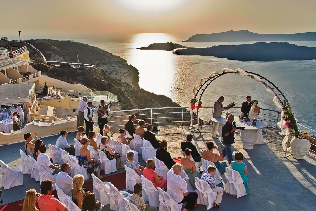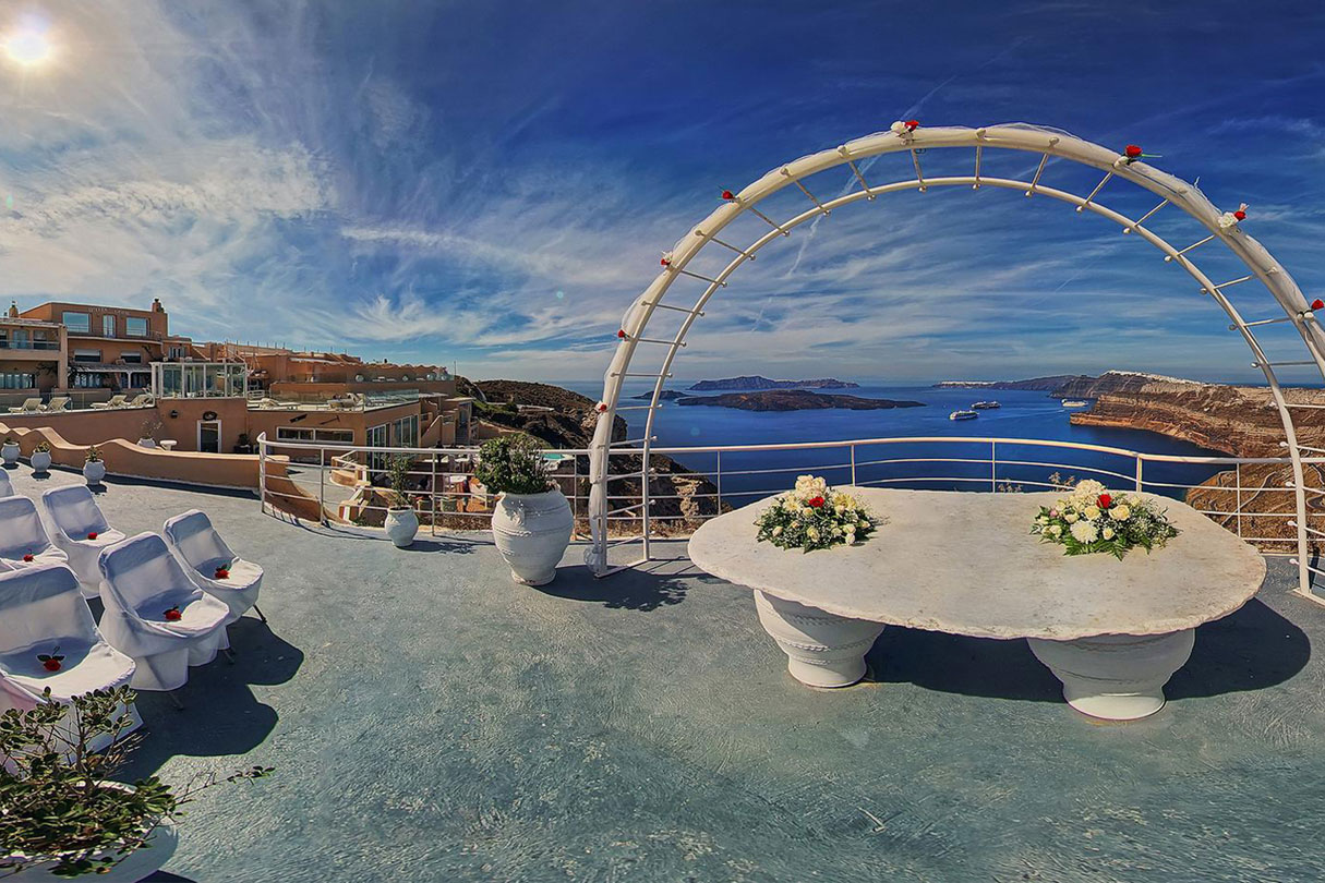 Use of the wedding terrace with outstanding Caldera views, white covered chairs, decorated Ceremonial arch with white veil, red carpet and a bottle of sparkling wine.